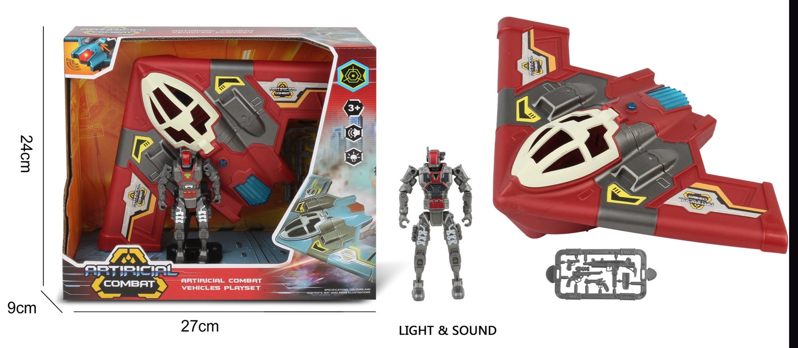 ARTICIAL COMBAT NAVE CON PERSONAJE CON LUZ Y SONIDO. QUE EMPIECE EL COMBATE. MEDIDA 15x26CM APROX.