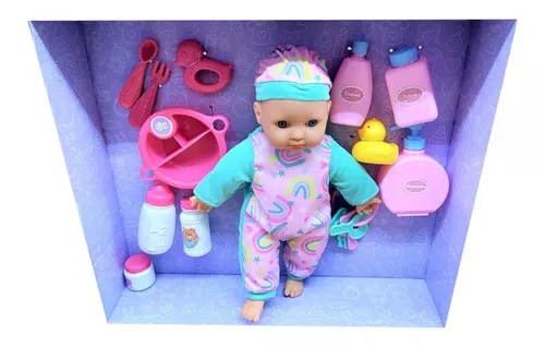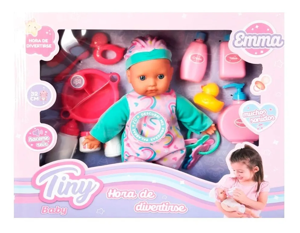BEBOTE TINY EMMA HORA DE DIVERTIRSE, CUERPO BLANDO CON 12 ACCESORIOS Y SONIDO. VIENE EN CAJA, MEDIDA 43x36x10CM APROX.