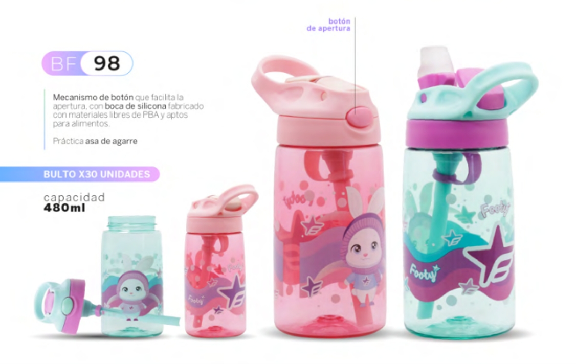 BOTELLA PLASTICO 2 MODELOS, MATERIAL IRROMPIBLE, RESISTENTE A LAS MANCHAS Y AL OLOR. CAPACIDAD 480ML.
