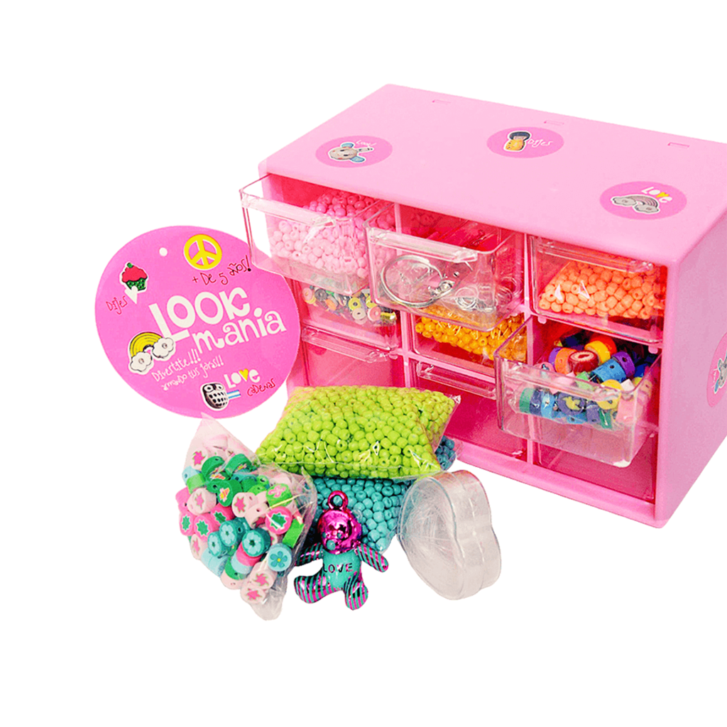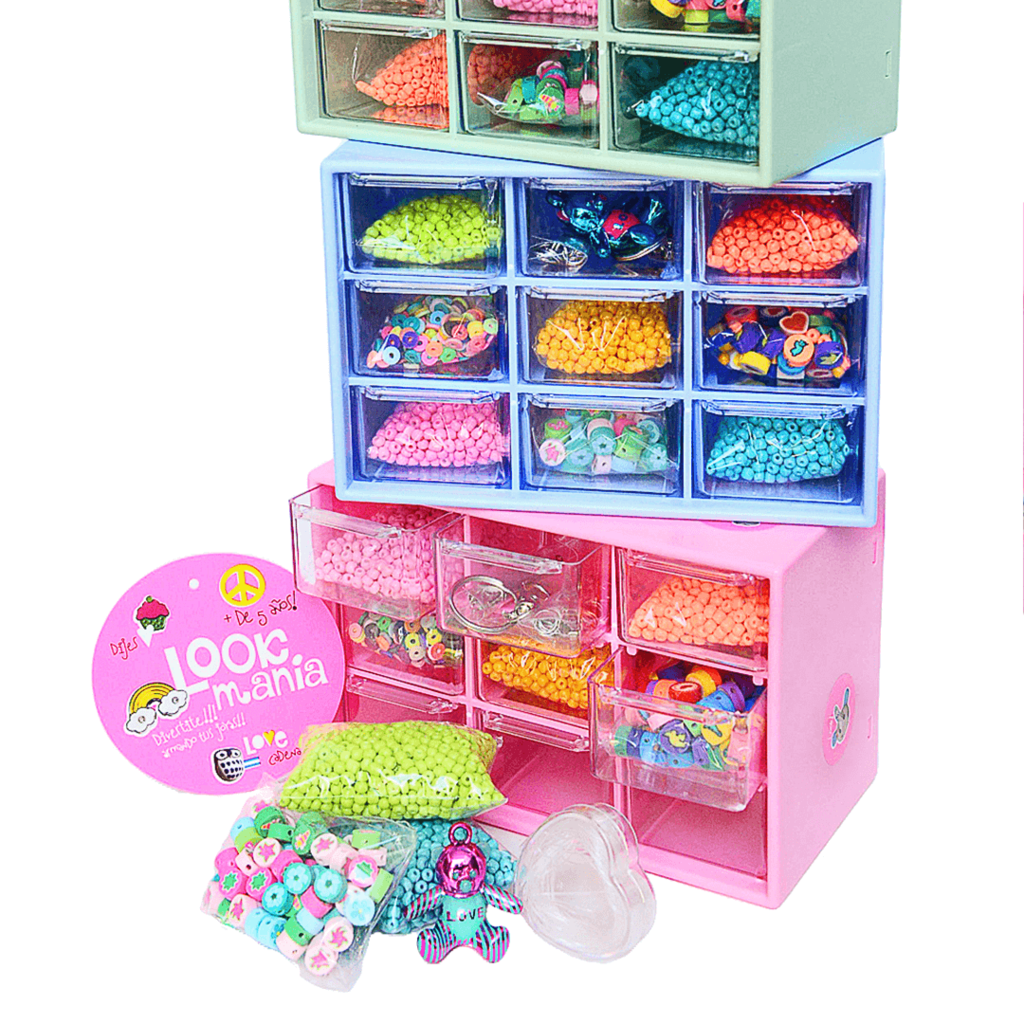 CAJONERA CON MOSTACILLAS ENGOMADAS. UNA CAJA MAGICA CON 3 PISOS DE CAJONCITOS REPLETOS DE MOSTACILLOS. CREA TUS PROPIAS JOYAS. INCLUYE VARIEDAD DE MOSTACILLOS DE VIDRIO Y ENGOMADAS, TANZA, LLAVERO, ARGOLLAS Y PALITOS, DIJES, CAJA CORAZON Y MAS. MEDIDA 18x11x9CM APROX.