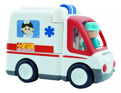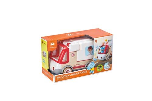 CAMION AMBULANCIA MODERNO DIDACTICO CON 1 MUÑECO Y ACCESORIOS. COMBINADO CON MADERA, LUZ Y SONIDO. TRAE UN CORDON PARA QUE PUEDAS ARRASTRARLO Y REQUIERE DE 3 PILAS.