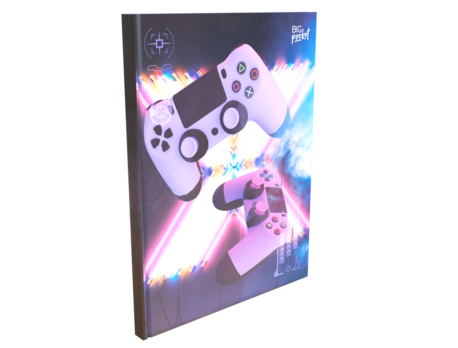 CUADERNO COSIDO GAME ZONE, STAMPING AZUL, LACA UV, POLI MATE, TAPA CARTON 2mm, ENCAPADO EN PAPEL ILUSTRADO, INTERIOR DE 48 HOJAS RAYADAS. MEDIDA 17x22CM. 2 MODELOS.