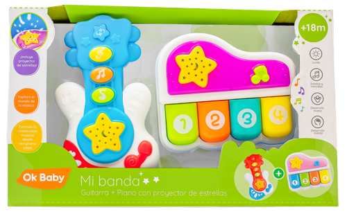 JUGUETE DIDACTICO SET MUSICAL GUITARRA + PIANO. CON LUZ, MELODIAS, SONIDOS Y PROYECTOR DE ESTRELLAS. RECOMENDADO PARA +18 MESES.