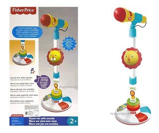 MICROFONO CON SONIDOS FISHER PRICE, ALTURA REGULABLE 40-70CM, RITMOS, EFECTOS DE SONIDOS, MELODIAS DEMO, LEON CON ENGANCHE CLIP, ANILLAS APLICABLES DE COLORES. PINZA DE MICROFONO, REQUIERE 3 PILAS AA. MEDIDA 20CM DE ANCHO, 40-70CM DE ALTO, 20CM DE FONDO APROX. CON CAJA.