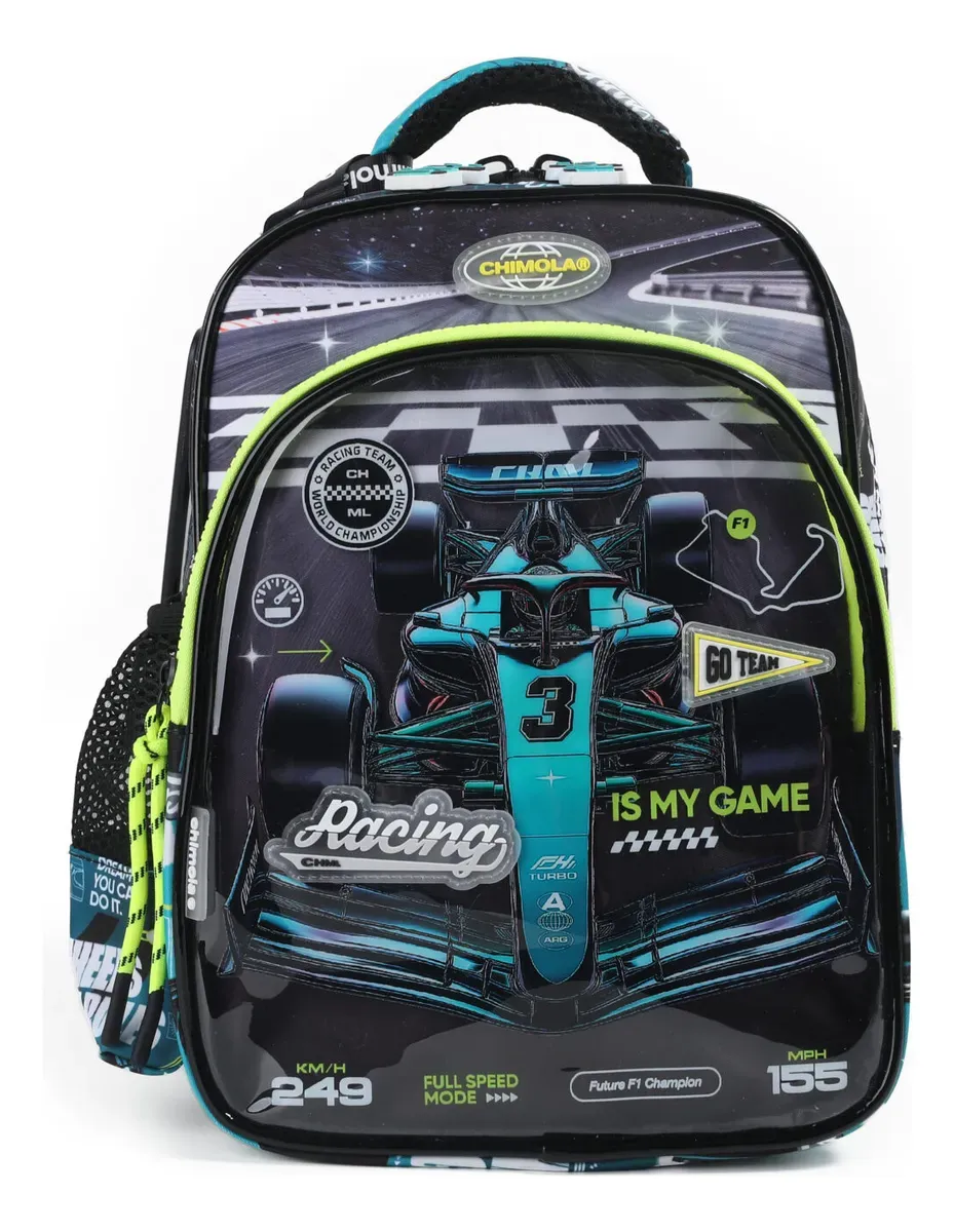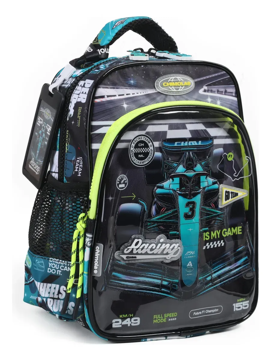MOCHILA ESPALDA RACING CAR 12″. 2 CIERRES PRINCIPALES, MUCHOS COMPARTIMIENTOS. 1 BOLSILLO LATERALE, TIRAS REFORZADAS.