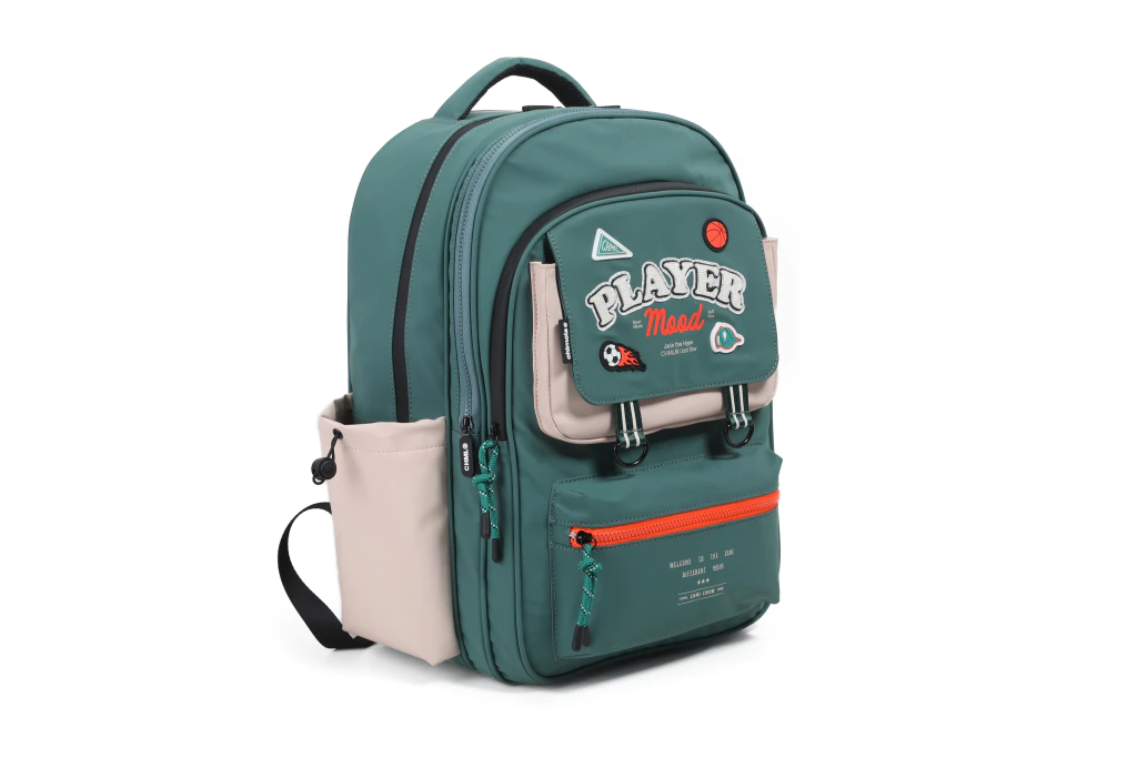 MOCHILA ESPALDA MODA BOY 18″. BOLSILLO FRONTAL CON APLIQUES, DISEÑO CON DETALLES UNIVERSITARIOS. COMPOSICION 100% NYLON, 4 MODELOS.