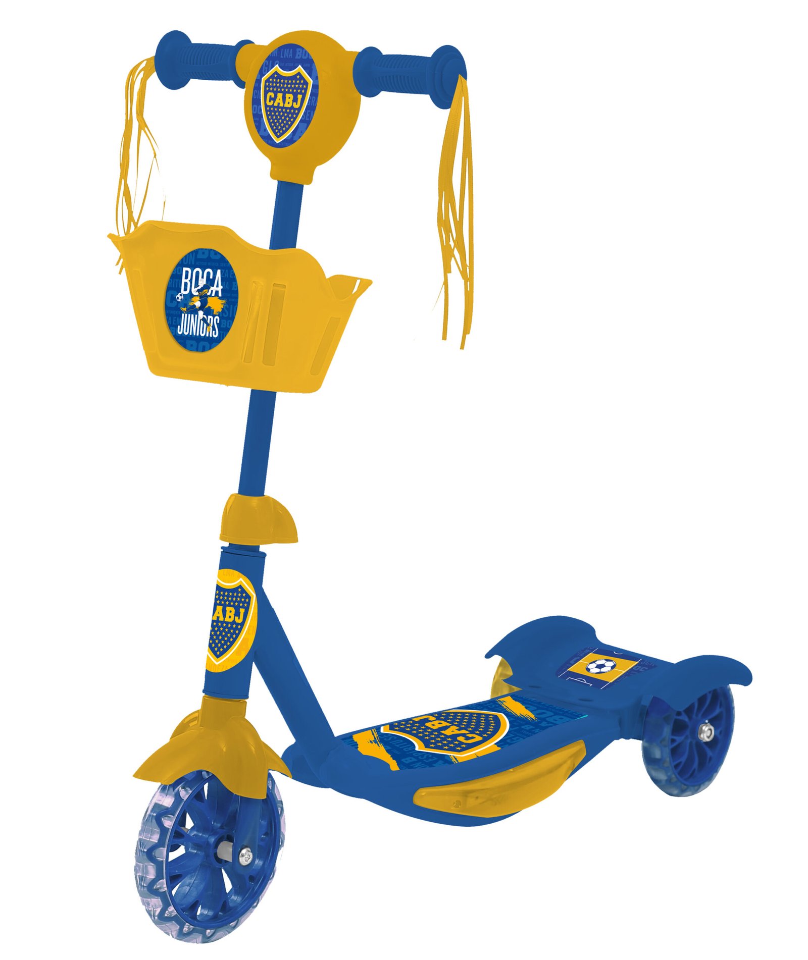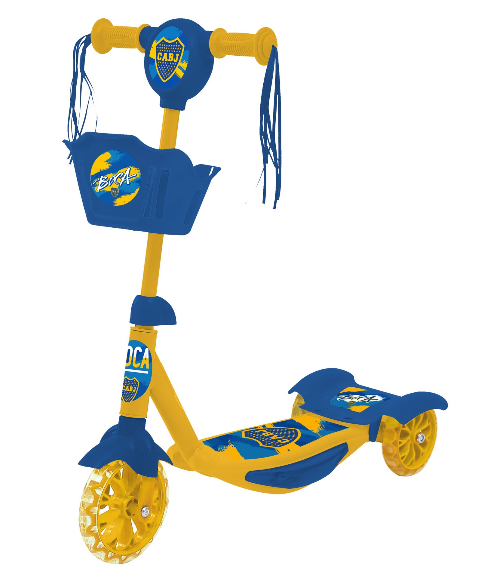 MONOPATIN PLEGABLE BOCA JUNIORS CON LICENCIA, CON LUZ Y SONIDO. 3 RUEDAS Y CANASTO. MEDIDA 61x60x16CM APROX.