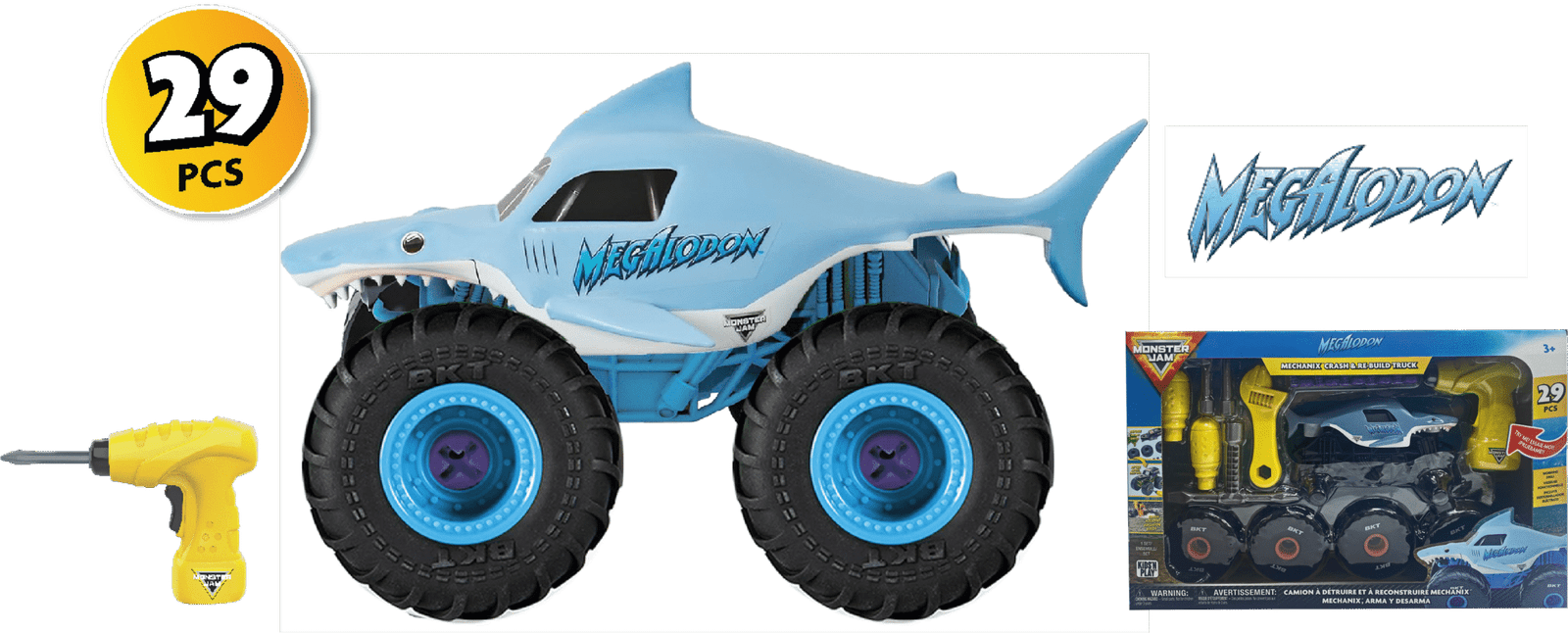 MONSTER JAM- MEGALODON. INCLUYE HERRAMIENTAS Y 2 TIPOS DIFERENTES DE TORNILLOS, AUTO TODO TERRENO, ESCALA 1:32. MEDIDA 46x12x30CM APROX.
