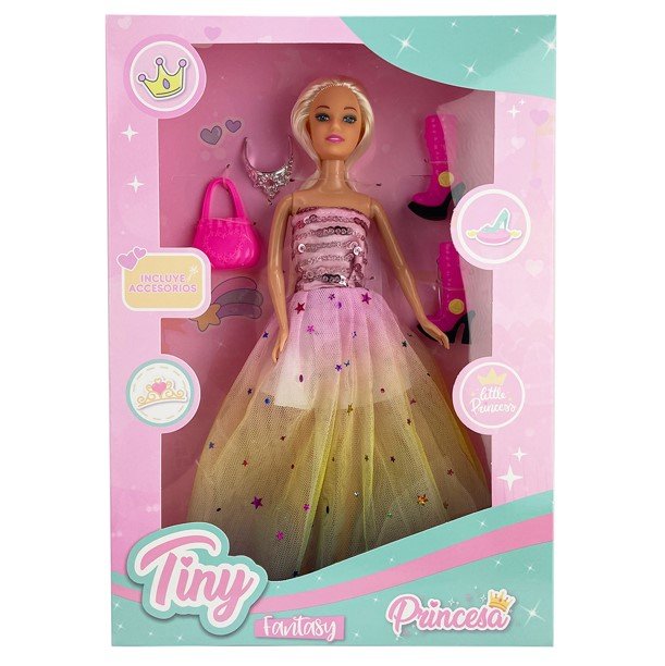 MUÑECA TINY FANTASY PRINCESA CON CORONA Y ACCESORIOS. MEDIDA 33x23x5CM APROX.