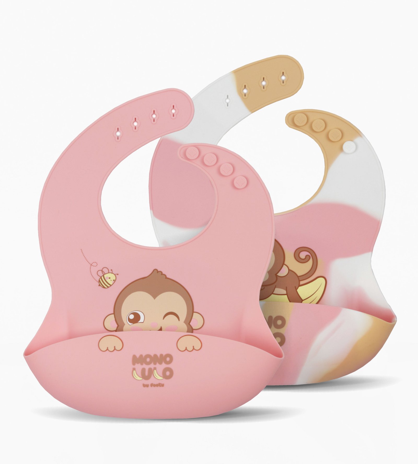 SET x2 PIEZAS MONO LULO. MATERIAL DE SILICONA NO TOXICO, CON VENTOSA EN LA PARTE INFERIOR PARA QUE NO SE MUEVA. 100% LIBRE DE BPA, BPS, PVC Y FTALATOS. APTO PARA LAVAJILLAS Y MICROONDAS. EL SET INCLUYE BABERO CON BOLSILLO DELANTERO PARA RECOGER COMIDA Y AJUSTE CON BOTONES, 2 COLORES.